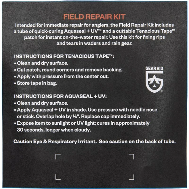 Quick-curing AQUASEAL® UV and Tenacious Tape patches for instant on-the-water repairs to waders and raingear.